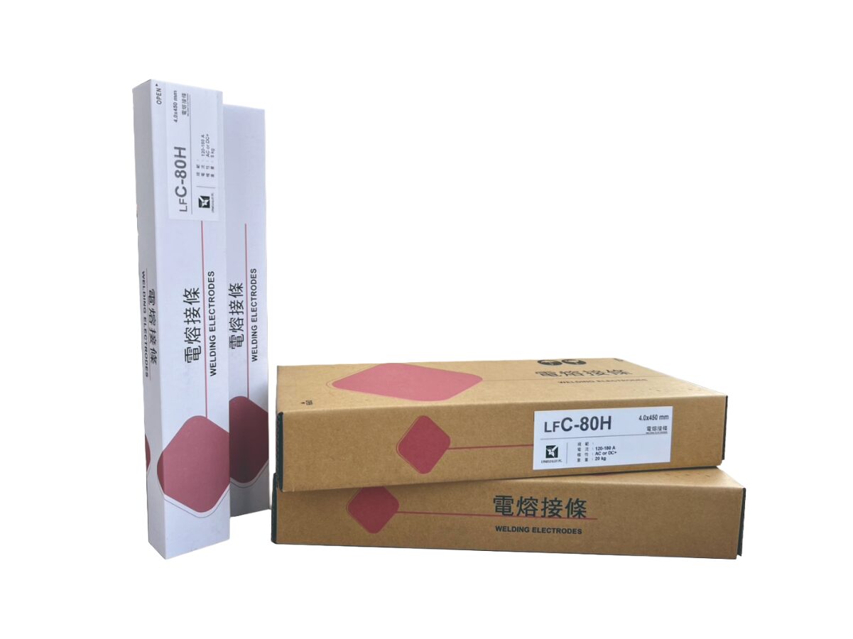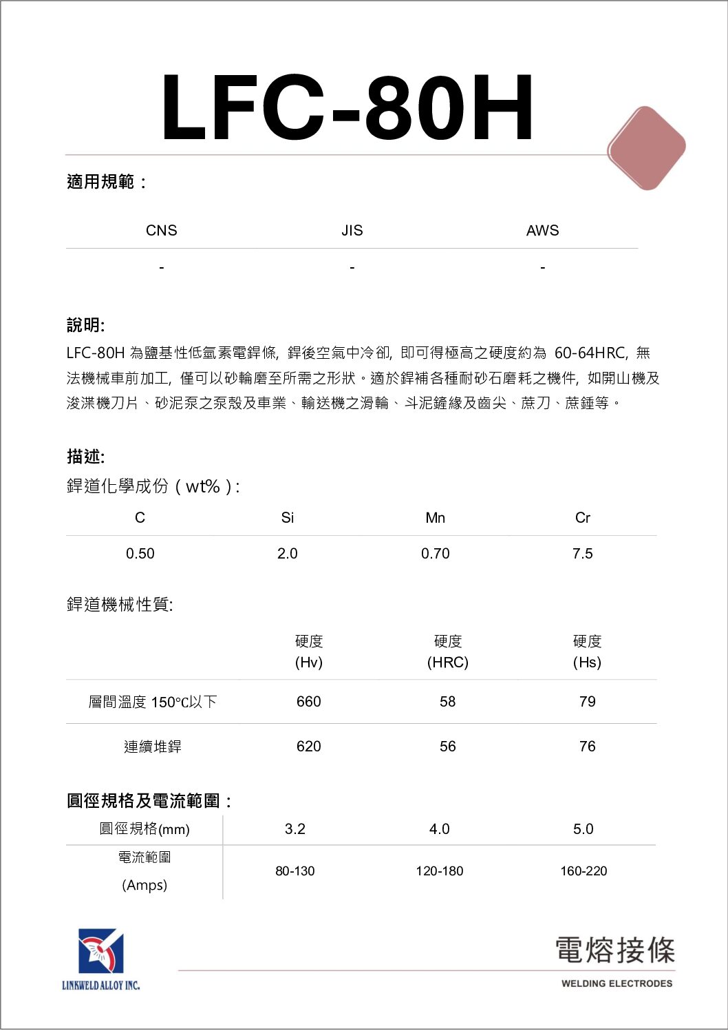 LFC-80H為鹽基性低氫素電銲條, 銲後空氣中冷卻, 即可得極高之硬度約為 60-64HRC, 無法機械車前加工, 僅可以砂輪磨至所需之形狀。適於銲補各種耐砂石磨耗之機件, 如開山機及浚渫機刀片、砂泥泵之泵殼及車業、輸送機之滑輪、斗泥鏟緣及齒尖、蔗刀、蔗錘等。